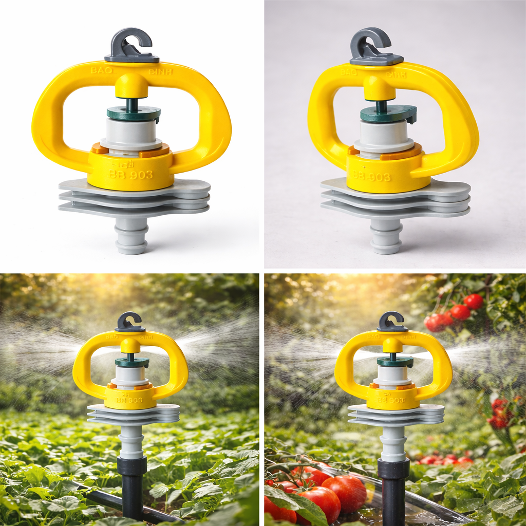 | BB-903Đ+ | Đuôi 6 ly | Có móc rời + Kết nối nhanh 6mm. | Cây trồng trong nhà màng, nhà lưới cần sự tinh gọn. | Vừa có thể treo cao, vừa có thể cắm gốc linh hoạt. |