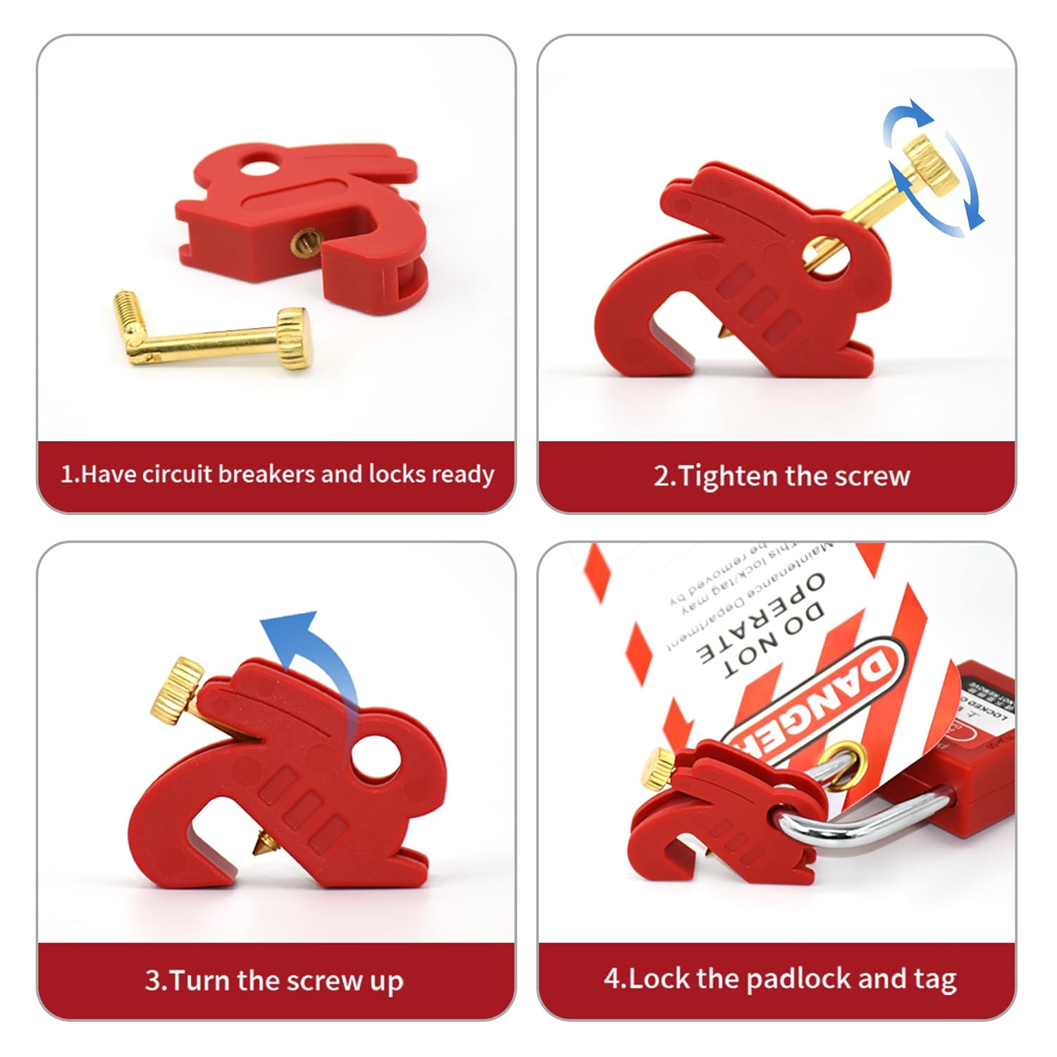 - Bước 4: Xỏ ổ khóa an toàn qua lỗ 8mm và treo thẻ cảnh báo (Tagout).