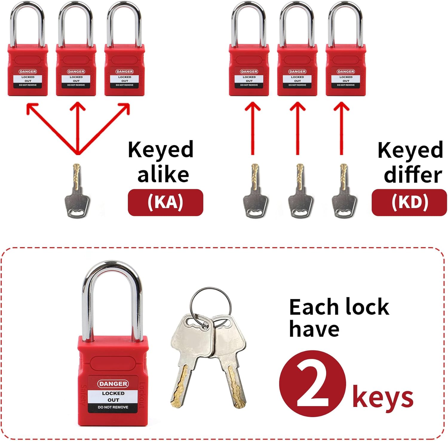 KAKeyed Alike (Chung Chìa)Tối ưu hóa hiệu quả quản lý. Một nhóm các khóa có thể được mở bằng cùng một chìa khóa. Ứng dụng: Phù hợp cho một đội nhóm hoặc một kỹ thuật viên cần quản lý nhiều điểm cách ly trên cùng một thiết bị hoặc khu vực làm việc, giảm số lượng chìa khóa cần mang theo.